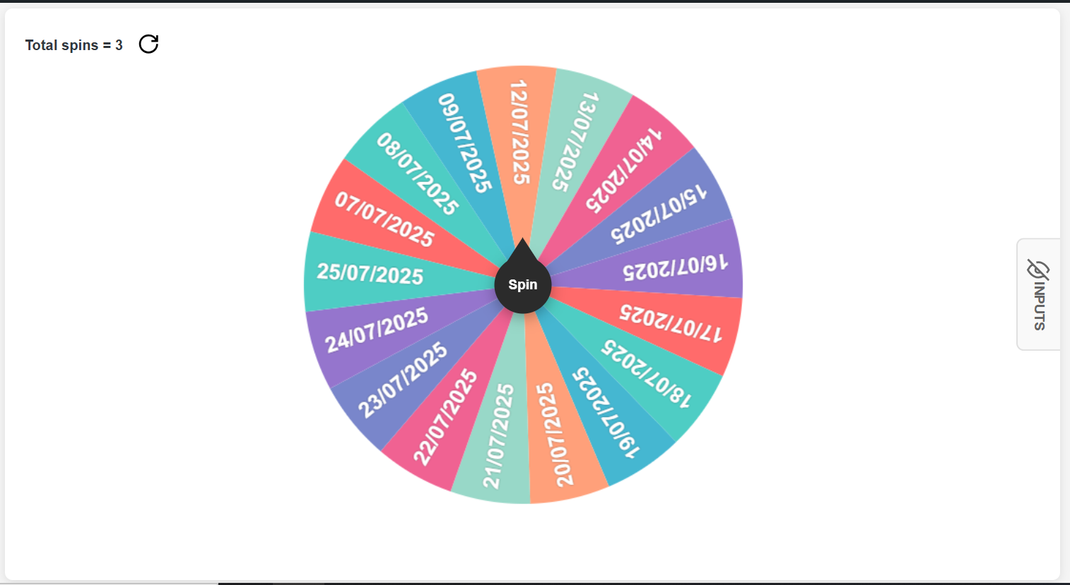 The chosen date is removed from the wheel, ensuring no repeats in upcoming spins. You can view which dates have been removed in the results history.