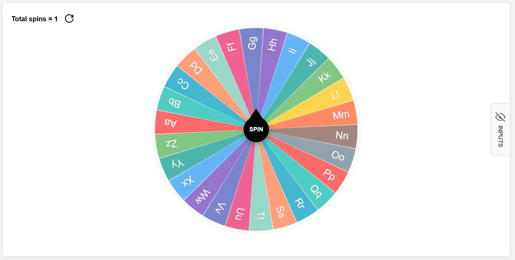 Each spin is completely random, and all letters remain in the pool for every spin. Perfect if you want repeats allowed.