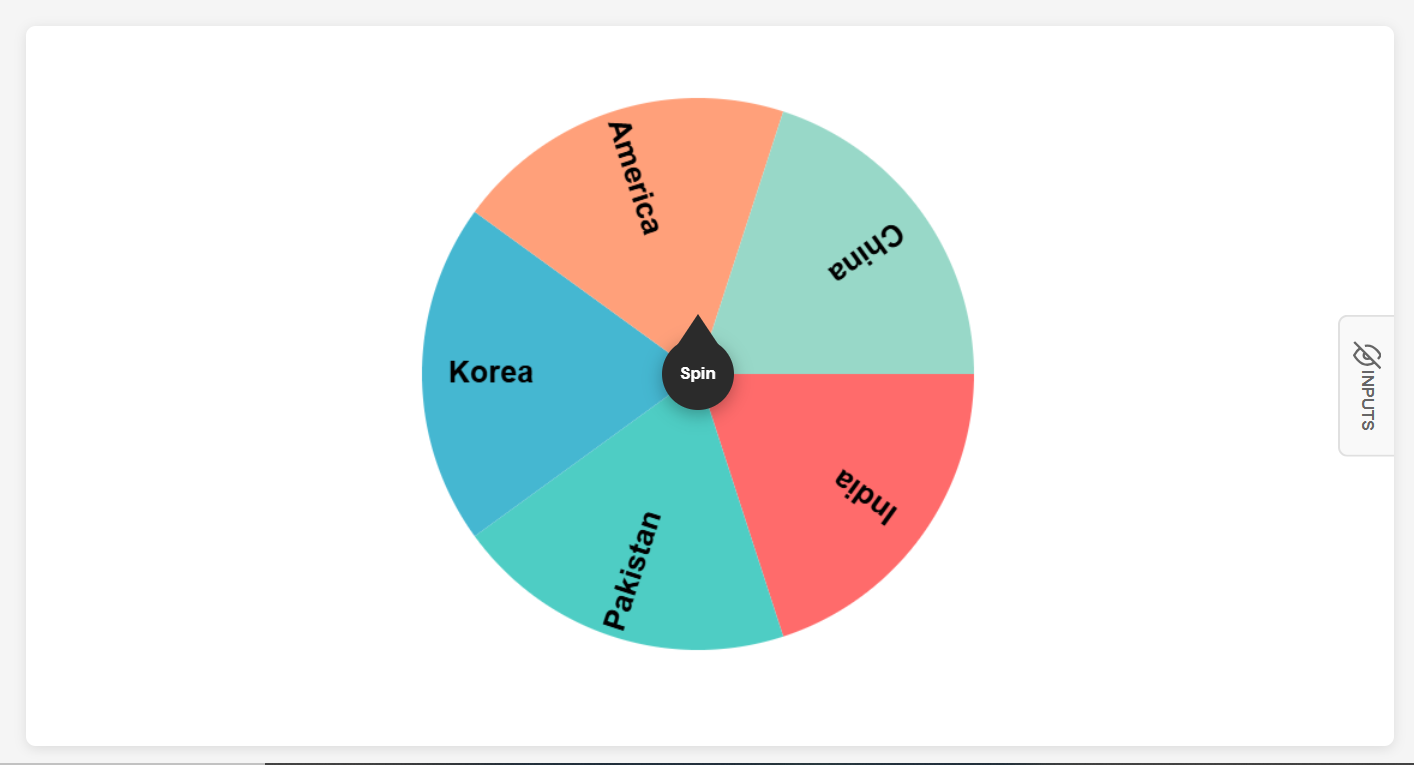 Hit the Shuffle button to randomize your inputs before spinning. Want to focus audience attention? Use the Hide Inputs