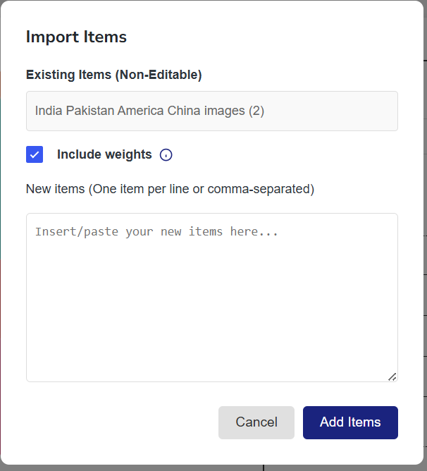 - You can enter text, images, or even both in the input section. Add items one by one by hitting the “+” button or pressing the return/enter key on your keyboard. For images click the “Add Image” button.